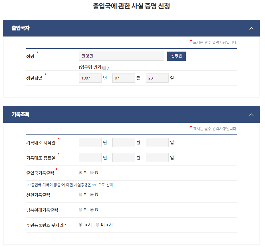 일단 저는 제 생애 전체 출입국 기록을 알고 싶어서, 생년월일부터 어제까지로 입력했네요.