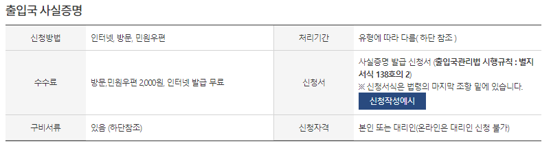 출입국 사실증명 출입국 사실증명 정보 신청방법, 처리기간, 수수료, 신청서, 구비서류, 신청자격 정보 제공 신청방법 인터넷, 방문, 민원우편 처리기간 유형에 따라 다름( 하단 참조 ) 수수료 방문,민원우편 2,000원, 인터넷 발급 무료 신청서 사실증명 발급 신청서 (출입국관리법 시행규칙 : 별지서식 138호의 2)※ 신청서식은 법령의 마지막 조항 밑에 있습니다. 신청작성예시 구비서류 있음 (하단참조) 신청자격 본인 또는 대리인(온라인은 대리인 신청 불가